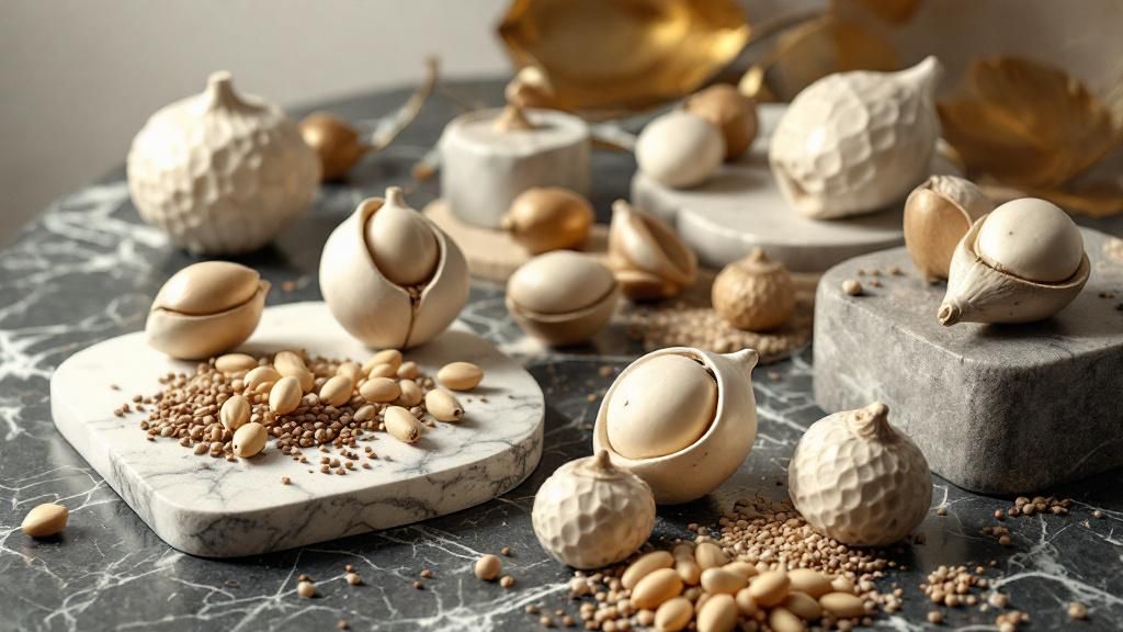 - Ceramic cocoa pods and bronze magnolia seeds tell stories with directness and confidence